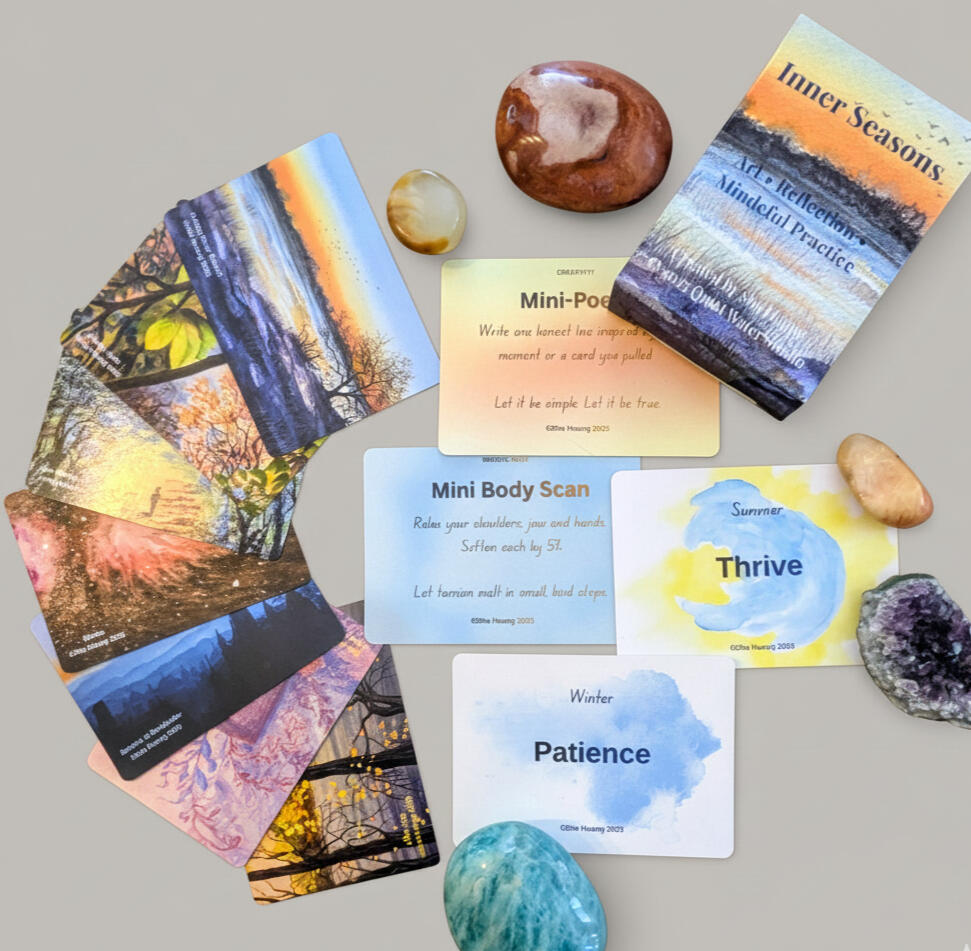 Inner Seasons is a 55-card deck designed to support daily mindfulness, emotional awareness, and creative inspiration through nature-based artwork, seasonal words, and simple practices.There is no single “right” way to use these cards. Let them meet you where you are.